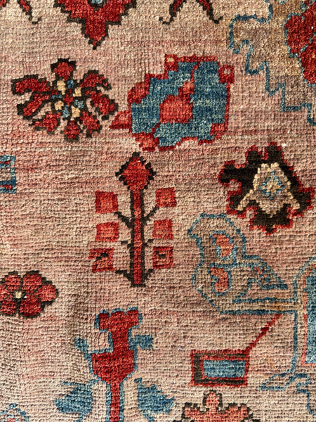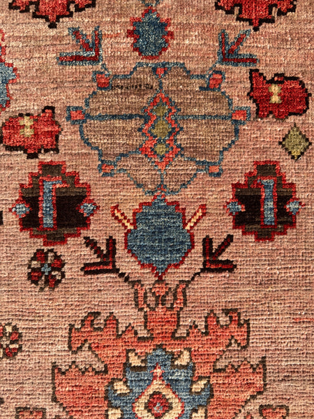 A wild and spirited Northwest Persian Heriz that brings all the personality. Woven in the early 1970s, this beauty has that cool mix of serrated medallions, hooked motifs, and angular blossoms floating across an aged, faint blush ground. It’s not perfectly mirrored and that’s exactly the charm. Your eye gets to wander, take in the rhythm of the design, and enjoy the whimsy throughout the rug.