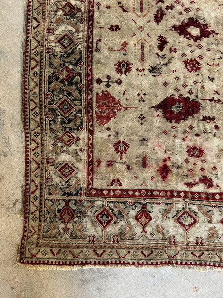 Love worn and with immense character, this small antique rug has seen a lot of life. Its shabby chic character earned through time will make a collector that loves a softened patina and age related wear, swoon.