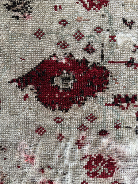 It's just an old soul with stories in the weave, a worn Turkish village rug from around 1900, handwoven in wool with a floppy, relaxed handle that drapes like fabric. The field is sprinkled with small florals, amulets, and little diamond medallions, all framed by charming borders that wander with rhythm and repeat. Time has softened everything… low pile, scattered wear, and a gentle, lived-in patina that only a century can paint.